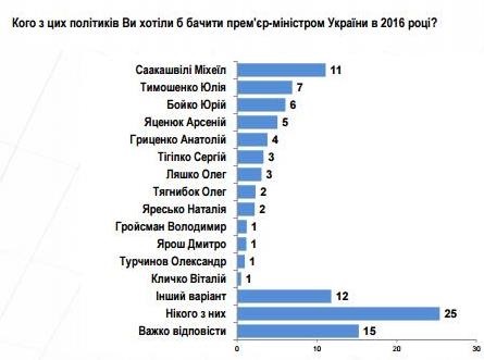 На вопрос о том, кому стоит отдать кресло премьера, 11% опрошенных ответили: главе Одесской ОГА Михаилу Саакашвили. 7% хотели бы видеть главой правительства Юлию Тимошенко, 6% - Юрия Бойко, 5% - Арсения Яценюка, 4% - Анатолия Гриценко.
