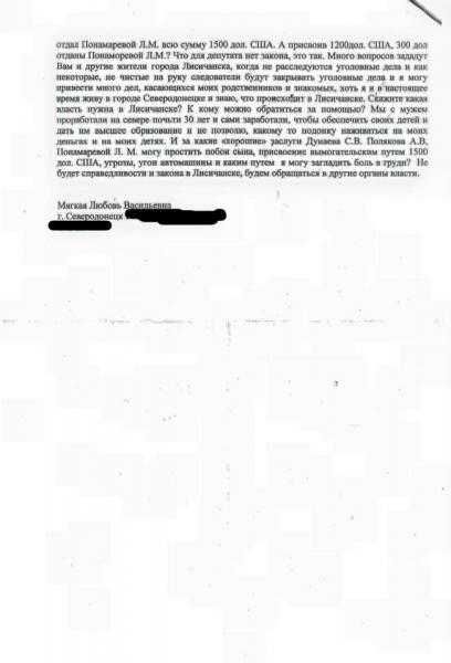 "Раздобыл старое письмо жительницы Лисичанска спикеру горсовета Бараннику, где она описывает как нынешний нардеп от Оппозиционного блога Сергея Дунаева забрал деньги и машину у её сына. До того как стать крепким хозяйственником народный депутат Дунаев подрабатывал рэкетиром, но кого в нашей стране волнуют такие мелочи?", - пишет журналист.