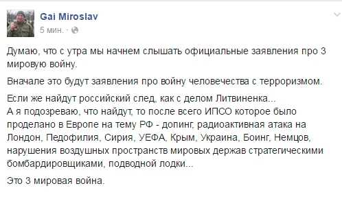 Волонтер Мирослав Гай написал в Фейсбуке о том, что "с утра мы начнем слышать официальные заявления про 3 мировую войну".