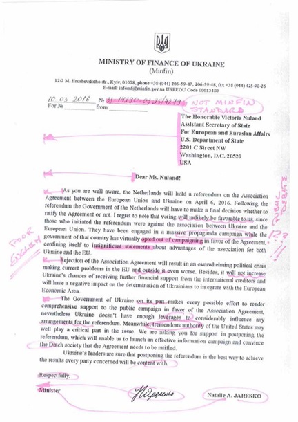 В "письме" Яресько, якобы, просит Вашингтон помочь перенести запланированный на 6 апреля референдум в Нидерландах по ассоциации Украина-ЕС.