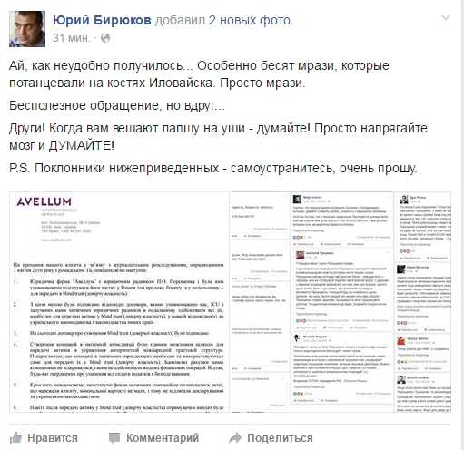 Также Юрий Бирюков опубликовал ответ компании Avellum на расследование об офшорах Порошенко.