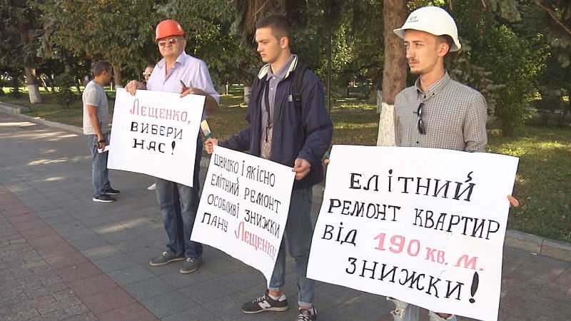 Кроме того, люди взяли с собой плакаты с надписями «Лещенко, выбери нас», «Быстро и качественно, элитный ремонт, особые скидки господину Лещенко», «Элитный ремонт квартир от 190 кв. м. Скидки».