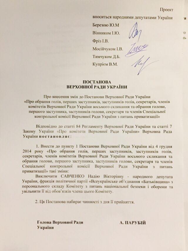 Источники сообщают, что большинство членов комитета выступает за срочное исключение Савченко. Документ, который запустит процедуру исключения Савченко, уже находится в Верховной Раде.