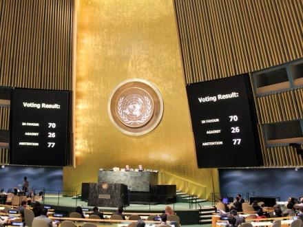 "Генеральная Ассамблея #ООН приняла украинскую резолюцию по #Крыму. За - 70, против - 26, воздержались - 77", - говорится в сообщении представительства Украины в ООН в Twitter.