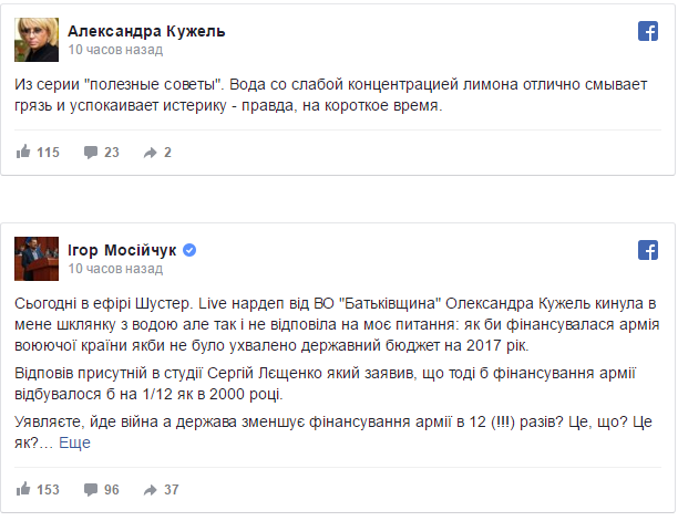В прямом эфире ток-шоу депутат от "Батькивщины" Александра Кужель плеснула водой в сидящего напротив нардепа-радикала Игоря Мосийчука.