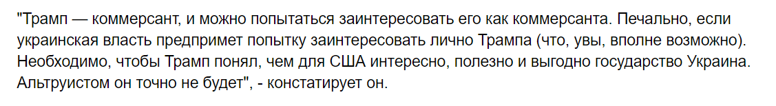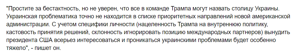 Рахманин также отметил, Киеву будет непросто наладить тесные отношения с США, так как украинский вопрос на данный момент не входит список важнейших приоритетов Трампа. При этом Рахманин отметил, что это и есть самый сложный момент, который стоит решить Киеву: