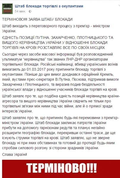 "Сегодня через средства массовой информации был распространен ультиматум "руководства" так называемых "ЛНР-ДНР" организаторам торговой блокады. Российские наемники, убийцы украинских воинов требуют до 01.03.2017 года прекратить блокаду торговли с оккупантами. Позже к этим требованиям присоединился официальный Кремль, который, устами пресс-секретаря Путина Пескова, поддержал требования Захарченко и Плотницкого и выразил недоумение по поводу бездействия украинской власти в отношении участников блокады торговли на крови.