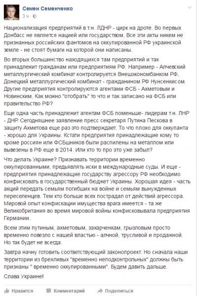 Еще одна часть принадлежит агентам ФСБ поменьше- лидерам т.н. ЛНР - ДНР. Сегодняшнее заявление пресс секретаря Путина Пескова в защиту Ахметова еще раз это подтверждает. То что плохо для оккупанта - хорошо для Украины. Кстати предприятия принадлежащие кому то кроме россиян или ФСБшников были распилены на металлом или вывезены в РФ еще в 2014. Или кто то про это уже забыл?" - написал Семенченко.