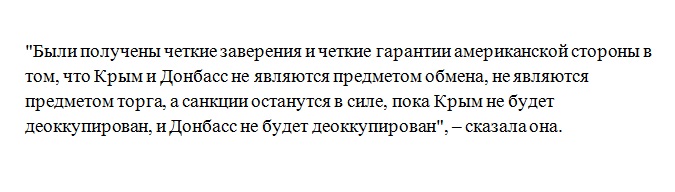 Беца отмечает, что официальный Киев получил серьезные гарантии от администрации Трампа о том, что Донбасс и Крым не будут предметом торга между США и Россией, а санкции в отношении РФ останутся до тех пор, пока Москва не освободит от своего присутствие отдельные районы Донецкой и Луганской областей.