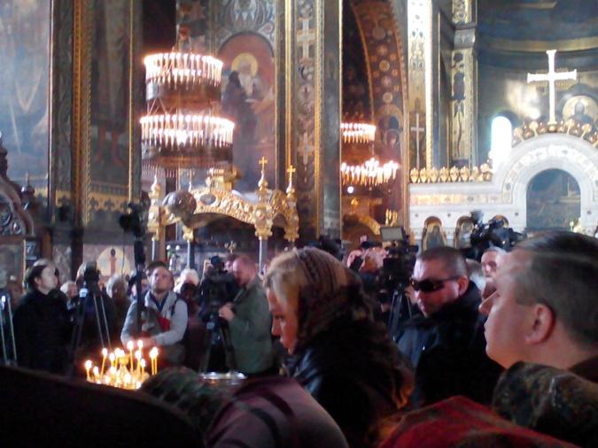 Под стенами храма собралось порядка ста человек, они держат флаг Украины, присутствуют фотографы и представители СМИ.