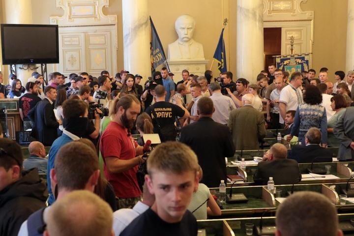 Сообщается, что львовский облсовет захватили люди, которые представились членами националистических организаций. Местный сайт zik пишет, что под видом националистов в облсовет ворвались русскоязычные парни, которые вели себя агрессивно, бросали дымовые шашки и выкрикивали лозунги. Они требовали от депутатов принять обращение к президенту Украины Петру Порошенко и Верховной Раде о принятии закона "Об амнистии в 2016 году", который бы позволил освободить из заключения бойцов АТО. В комментарии изданию начальник штаба «Национального корпуса» Львовской области Святослав Серый заявил, что в захвате здания принимали участие приезжие из других регионов Украины.