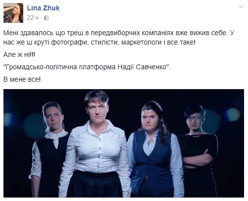 "Мне казалось что трэш в предвыборных компаниях уже выжил себя. У нас же крутые фотографы, стилисты, маркетологи и все такое! Но ведь нет!!! "Общественно-политическая платформа Надежды Савченко". У меня все!"
