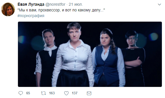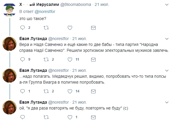 "Вера и Надя Савченко и ещё какие-то две бабы - типа партия "Народна справа Надії Савченко". Решили эротизмом электоральных мужиков завлечь надо полагать. Медведчук решил, видимо, попробовать что-то типа попсы а-ля Группа Виагра в политике попробовать", - написали пользователи.