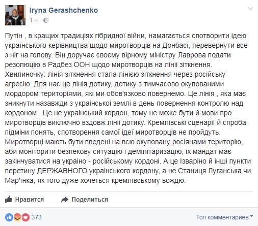 "Миротворцы должны быть введены на всю оккупированную руссиянами территорию, чтобы мониторить ситуацию с безопасностью и демилитаризацию, их мандат должен заканчиваться на украино - российской границе", - написала Геращенко.