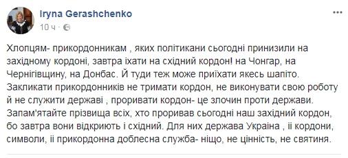 По словам первого заместителя главы Верховной Рады Ирины Геращенко, поступки Саакашвили и его сторонников - "это действо не против украинской власти или президента, а преступление против украинского государства".