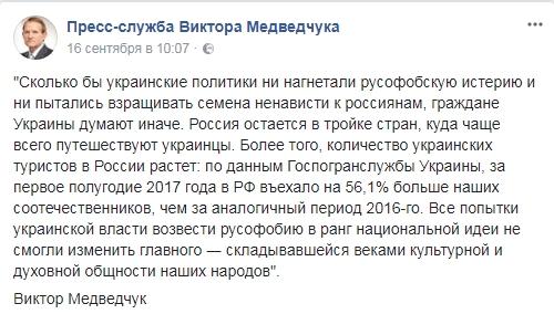 Одиозный политик обвинил киевские власти в "нагнетании русофобской истерии" и "взращивании семян ненависти к россиянам". Медведчук заявил, что "украинцы думают иначе" и продолжают ездить в Россию в качестве туристов.