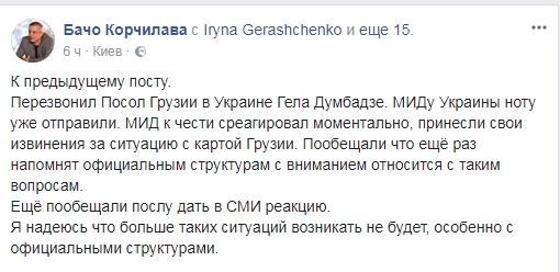 Спустя время Корчилава написал в соцсети, что МИДу Украины ноту протеста уже направили. В ведомстве принесли свои извинения и пообещали ещё раз напомнить официальным структурам с вниманием относится с таким вопросам.
