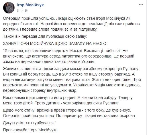 "Операция прошла успешно. Врачи оценивают состояние Игоря Мосийчука как средней тяжести. Сейчас его перевели в реанимацию, он уже пришел в себя, и передает слова благодарности за поддержку", - говорится в сообщении.
