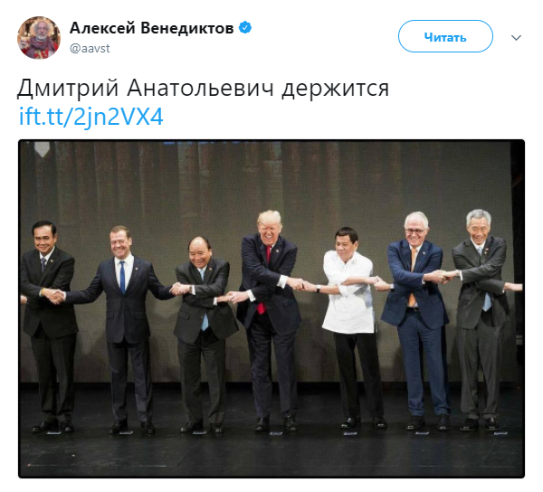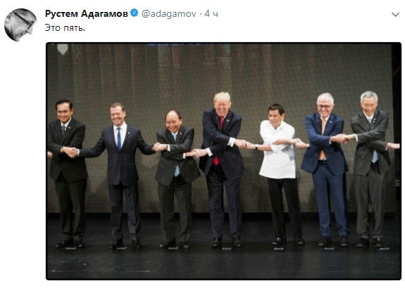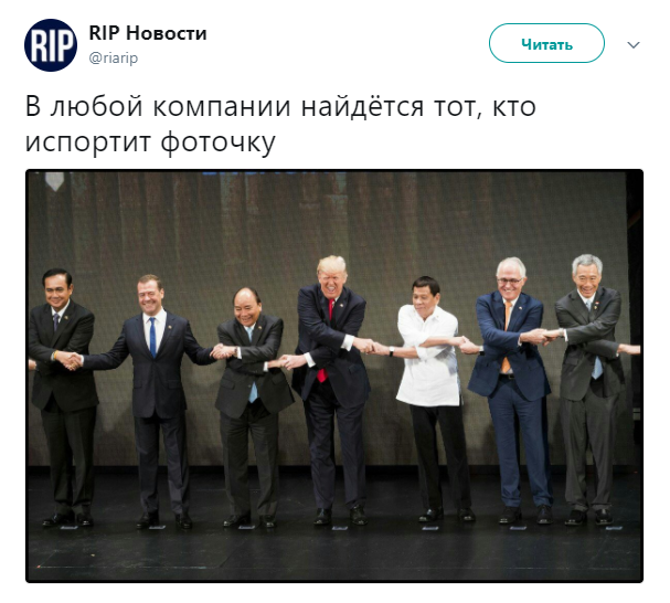 Сейчас в Маниле проходит саммит Ассоциации государств Юго-Восточной Азии (АСЕАН). На церемонии открытия этого мероприятия обычно делается групповое фото, на котором лидеры государств-участников пожимают друг другу руки, скрестив их.