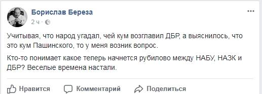 "С удивлением узнал, что Роман Труба мой кум. Разочаровался. И должен вас разочаровать - это не так. Прошу не цитировать "дурню". Тот, кто это запускает, наверное имел планы на конкурс главы Государственного Бюро расследований и теперь, видимо, очень разочарован и играет в "дискредитацию" нового главы ГБР, обвиняя в связях с политиками", - написал Пашинский в соцсети.
