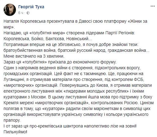 Заместитель министра по вопросам временно оккупированных территорий и внутренне перемещенных лиц Георгий Тука рассказал о выступлении на международном экономическом форуме в Давосе народного депутата от «Оппозиционного блока» Натальи Королевской.