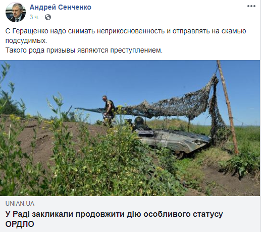 Член "Батькивщины" Андрей Сенченко в ответ на это заявил, что "с Геращенко надо снимать неприкосновенность и отправлять на скамью подсудимых", потому что, по его мнению, "такого рода призывы являются преступлением".