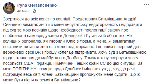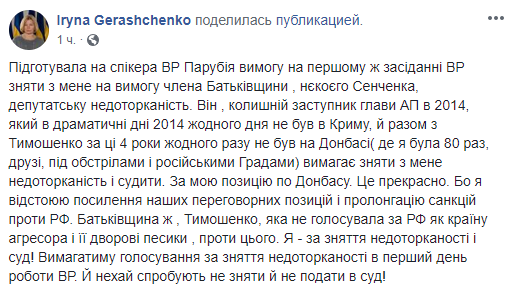 "Подготовила на спикера ВР Парубия требование на первом же заседании ВР снять с меня по требованию члена Батькивщины, некоего Сенченко, депутатскую неприкосновенность. Он, бывший заместитель главы АП в 2014, который в драматические дни 2014 ни дня не был в Крыму, и вместе с Тимошенко за эти 4 года ни разу не был на Донбассе (где я была 80 раз, друзья, под обстрелами и российскими Градами) требует снять с меня неприкосновенность и судить. За мою позицию по Донбассу. Это прекрасно. Я отстаиваю усиление наших переговорных позиций и пролонгации санкций против РФ. Батькивщина же, Тимошенко, которая не голосовала за РФ как страну агрессора и ее дворовые собачки, против этого. Я - за снятие неприкосновенности и суд! Буду требовать голосования за снятие неприкосновенности в первый день работы ВР. И пусть попробуют не снять и не подать в суд!" - написала Геращенко в Фейсбуке.