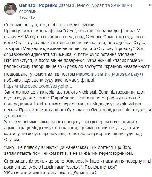 Телеведущий и актер Геннадий Попенко в Фейсбуке рассказал, что в сценарии фильма "Стус" изначально была сцена последнего суда над поэтом. Но позже убрали и ее, и самого персонажа Медведчука.