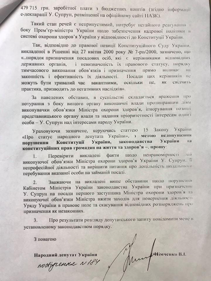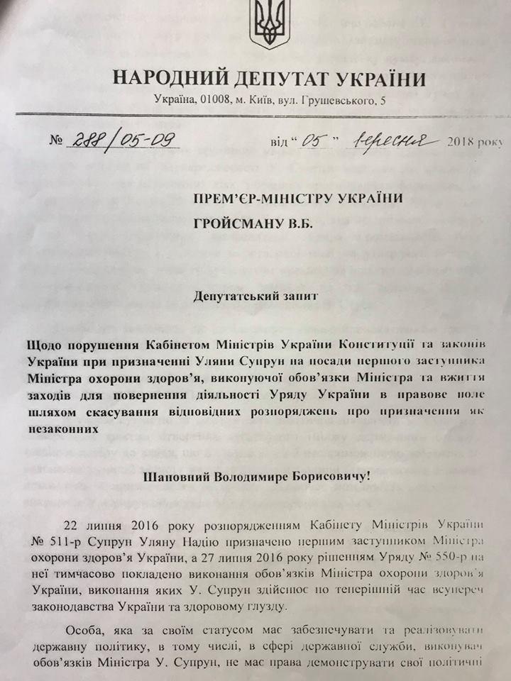 Исполняющая обязанности министра здравоохранения Ульяна Супрун опубликовала в Фейсбуке копию депутатского запроса нардепа от "Оппоблока" Василия Нимченко. В документе парламентарий просит премьер-министра снять Супрун с занимаемой должности, передает Час Пик.