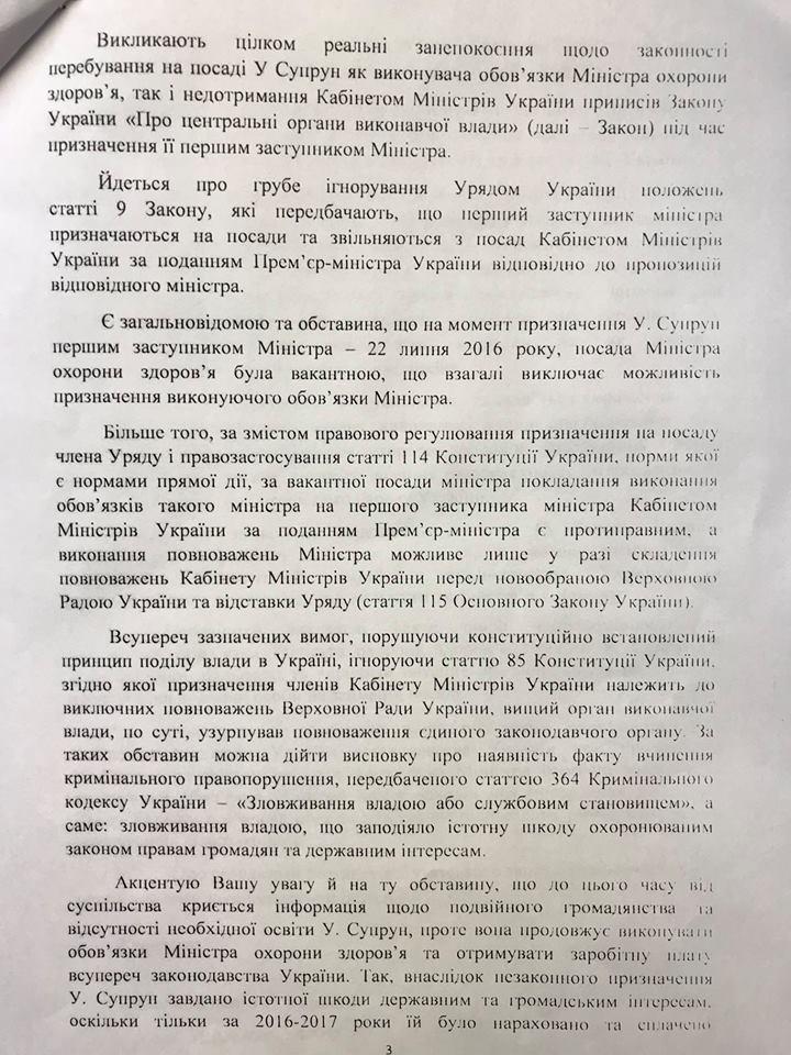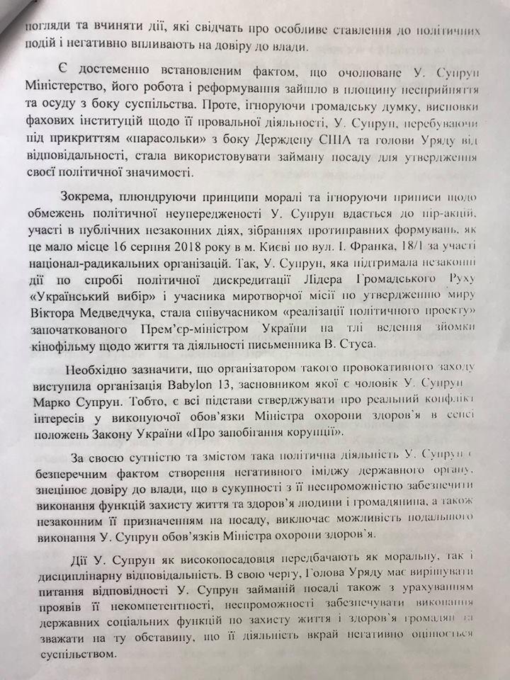 "... попирая принципы морали и игнорируя предписания об ограничении политической беспристрастности У. Супрун прибегает к пиар-акциям, участиям в публичных незаконных действиях, собраниях противоправных формирований, как это имело место 16 августа 2018 года в г. Киеве по ул. И. Франко, 18/1 с участием национал-радикальных организаций. Так, У. Супрун, которая поддержала незаконные действия по попытке политической дискредитации Лидера Общественного Движения Виктора Медведчука, стала соучастником "реализации политического проекта" основанного Премьер-министром Украины на фоне ведения съемки фильма о жизни и деятельности писателя В. Стуса".