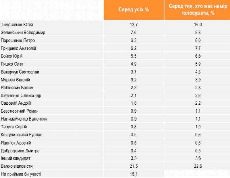 Согласно результатам опроса, с большим отрывом лидирует глава "Батькивщины" Юлия Тимошенко - за нее готовы отдать свои голоса на президентских выборах 12,7% среди всех опрошенных, за шоумена Зеленского – 7,6%, за действующего президента Порошенко – 6,3%. На четвертом месте находится кандидатура Анатолия Гриценко – 6,2%.