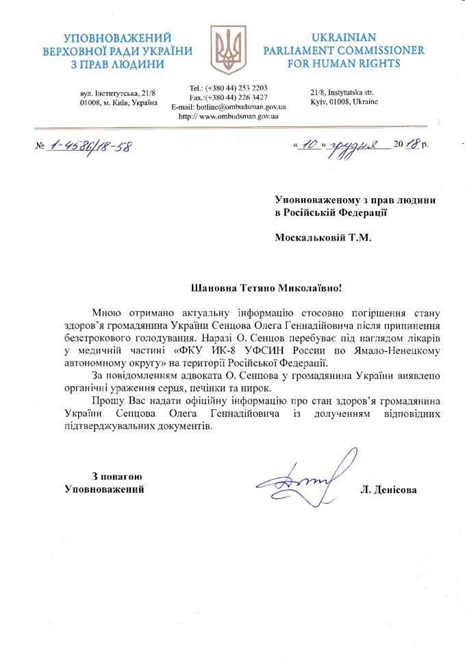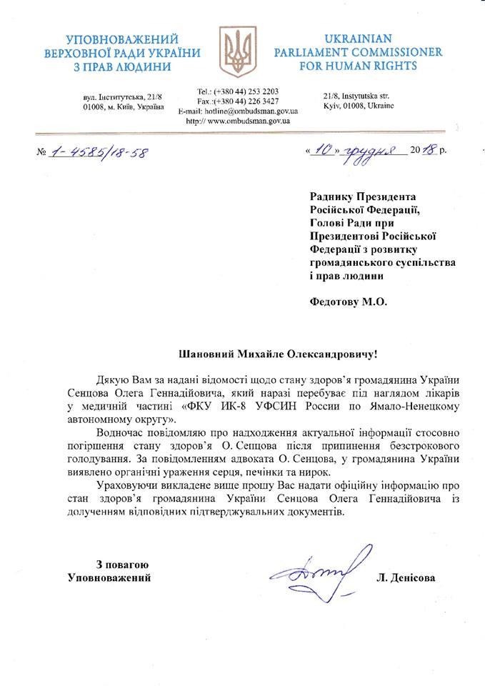 Уполномоченная Верховной Рады Украины по правам человека Людмила Денисова обратилась с официальным запросом к своей российской коллеге Т. Москальковой и советнику президента РФ М. Федотову в связи с сообщением адвоката Олега Сенцова Дмитрия Динзе о состоянии здоровья его подзащитного. Напомним, вчера адвокат сообщил об ухудшении физического состояния украинского режиссера.
