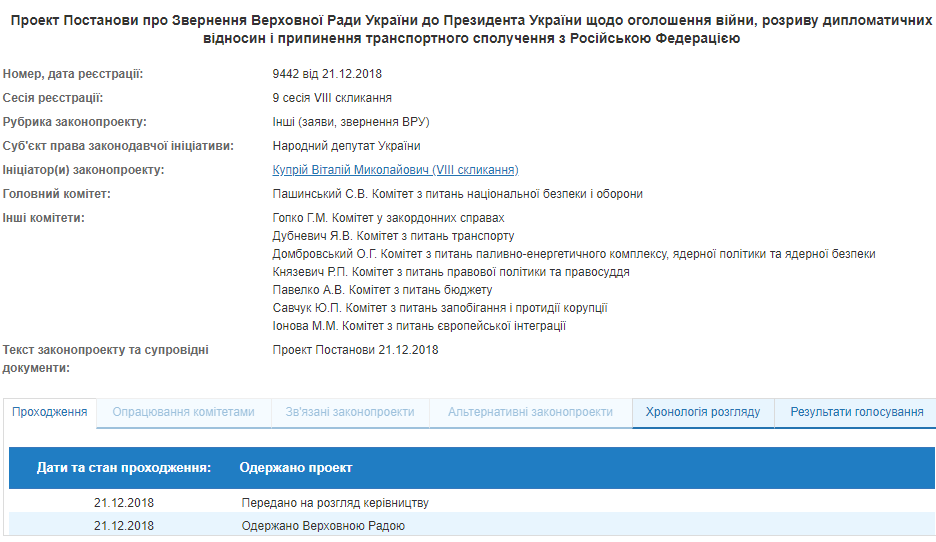 21 декабря в парламенте зарегистрирован проект Постановления об Обращении Верховной Рады Украины к Президенту Украины относительно объявления войны, разрыва дипломатических отношений и прекращения транспортного сообщения с Российской Федерацией.