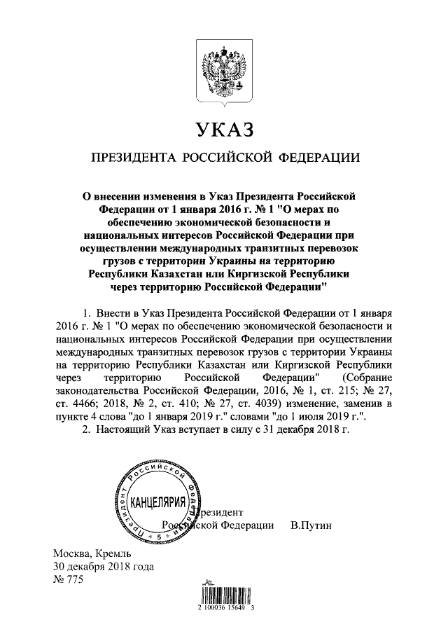 30 декабря Путин подписал указ № 775 "О внесении изменения в Указ Президента Российской Федерации от 1 января 2016 г. № 1 "О мерах по обеспечению экономической безопасности и национальных интересов Российской Федерации при осуществлении международных транзитных перевозок грузов с территории Украины на территорию Республики Казахстан или Киргизской Республики через территорию Российской Федерации".