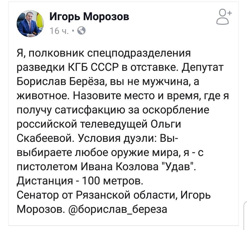 Конфликт начался после того, как Береза жестко осадил кремлевскую пропагандистку Ольгу Скабееву в ПАСЕ. Возмущенный такими событиями Морозов написал в Фейсбуке пост, в котором вызвал Березу на дуэль. Правда, вскоре публикация была удалена.