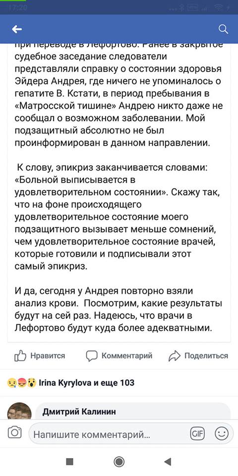Кроме того, по ее словам, информацию о гепатите В и С Андрею Эйдеру россияне сообщили лишь во время перевода из "Матросской тишины" в "Лефортово". В самой "Матросской тишине" парню ничего не сообщали о возможном заболевании.