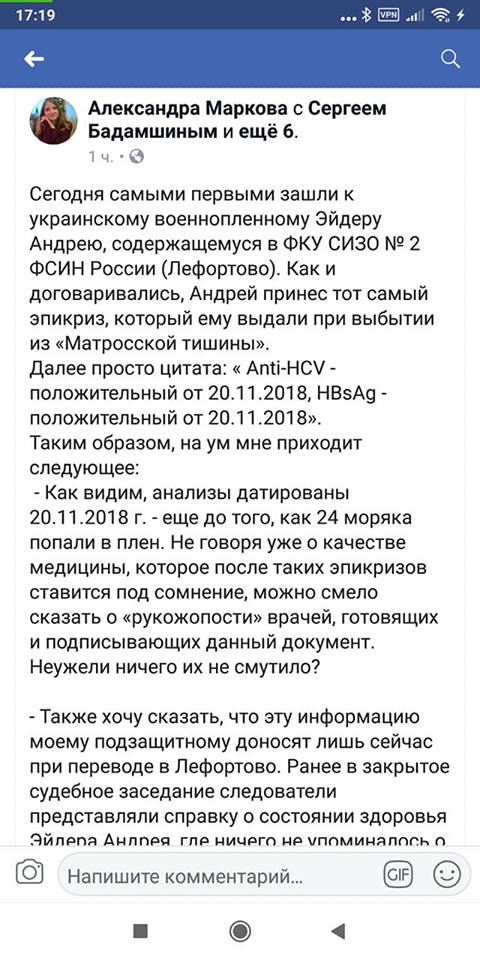 Маркова написала: "Андрей принес тот самый эпикриз, который ему выдали во время отправления из "Матросской тишины". Дальше просто цитата: "Anti-HCV - положительный от 20.11.2018, HBsAg - положительный от 20.11.2018", - передает Час Пик со ссылкой на страницу защитницы в Facebook.