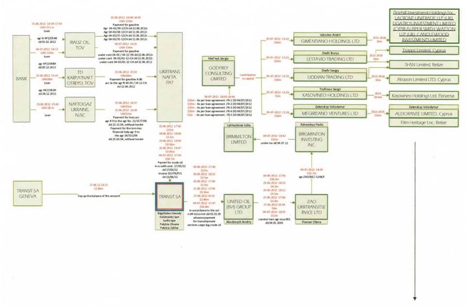В течение нескольких дней 38,2 млн долларов США были выведены из Укртранснафта на счета компании Transit SA в Кипрском филиале Банка, зарегистрированном в Швейцарии на Игоря Коломойского (32,5%), Геннадия Боголюбова (32,5%) и Игоря Суркиса (25 %).