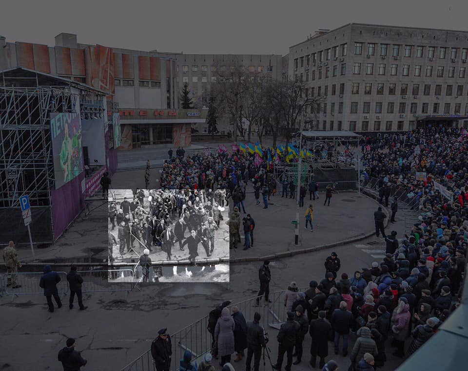 Пресс-секретарь президента Святослав Цеголко у себя в Фейсбуке наглядно показал, из какого фото вырезали фрагмент. На самом деле Порошенко никуда не убегал, а, наоборот, мчался пообщаться с людьми.
