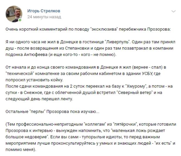 Бывший предводитель подразделений незаконных вооруженных формирований «ДНР» Игорь Стрелков (Гиркин) на своей странице в соцсети опроверг заявления сбежавшего в Россию экс-сотрудника СБУ Василия Прозорова о том, что проживал в гостинице "Ливерпуль".