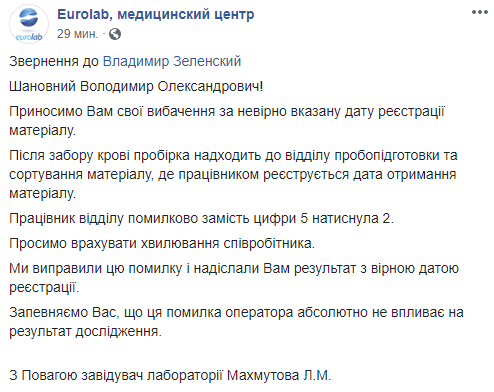Тем временем Eurolab уже принесли извинения Зеленскому за ошибку в документе.