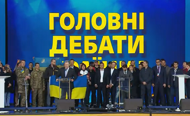 Хотя изначально планировалось, что кандидаты будут выступать на разных сценах, в начале дебатов Порошенко со своей командой внезапно пришел на сцену к Зеленскому. Там кандидаты пожали друг другу руки.
