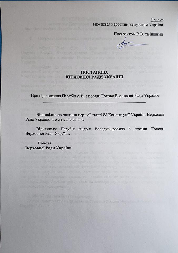 Народный депутат из партии "Видродження" Валерий Писаренко начал сбор подписей за отставку главы Верховной Рады Андрея Парубия.