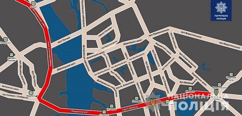 Он также приложил к посту обнародованную полицией схему улиц, которые будут перекрыты в понедельник в Киеве.