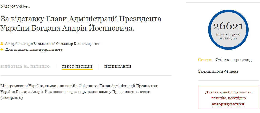На сайте Президента Украины необходимое для рассмотрения количество голосов набрала петиция за отставку главы Администрации Президента Андрея Богдана.