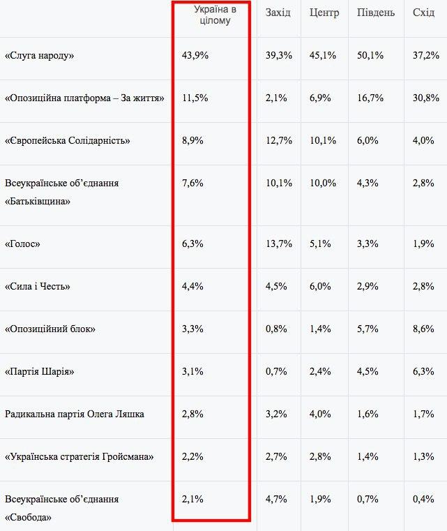 За партию президента проголосовали на западе 39,3%, 45,1% - в центре, 50,1% - на юге и 37,2% - на востоке Украины.