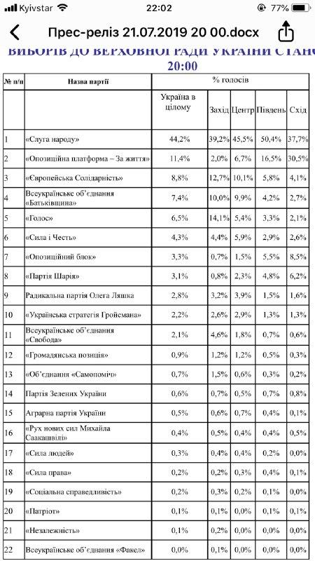1. "Слуга народа" - 44,2% (первый результат - 43,9%)
