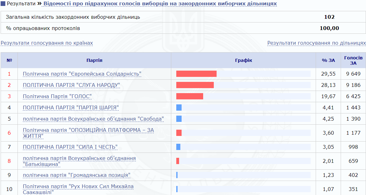Больше всего голосов от украинцев за рубежом получила партия "Европейская Солидарность" (29,55%), партия "Слуга народа" набрала 28,13%, третью позицию занимает партия "Голос" (19,67%).