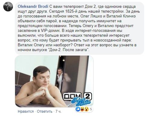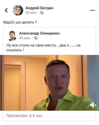 Позже это видео прокомментировал находящийся в розыске экс-нардеп регионал Александр Онищенко, а глава Офиса президента Андрей Богдан сделал репост его комментария. На что Ляшко оставил также пост с текстом: