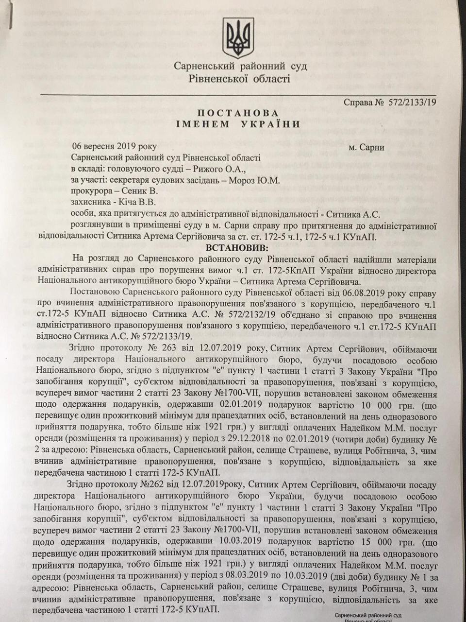 Сарненский районный суд признал директора НАБУ Артема Сытника виновным в административном нарушении во время отдыха в охотничьем угодье "Полесское-Сарны" Ровенской области и присудил штраф в размере 3 400 гривен.